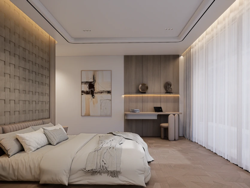 For instance, a living room in a villa may feature a classic panelled wall in soft cream tones paired with a velvet sectional, layered rugs, and throw cushions. This combination creates a space that feels luxurious yet inviting—an ideal approach for contemporary home interiors.