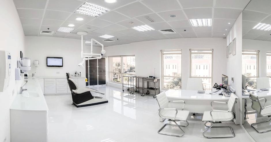 A dental clinic requires durable, non-porous, easy-to-clean materials. These ensure a sterile and hygienic interior design environment.